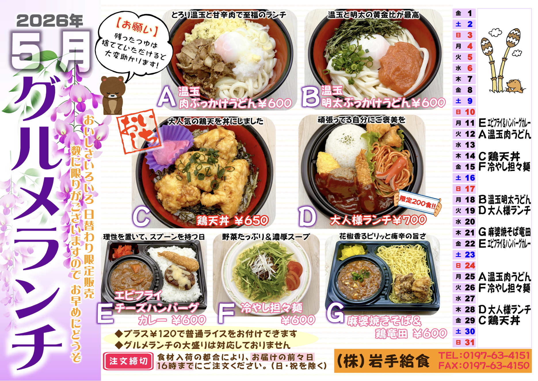 ホーム mainmain 毎日のお弁当メニュー 2026年4月29日(水) ◎昭和の日◎ 2026年4月30日(木) ・味彩&はなまる弁当 *海老カツ ・グルメランチ *お休み 今月の日替わり弁当メニュー お弁当メニュー表 »クリックして拡大する(PDF) »クリックして拡大する(PDF) もっと見る